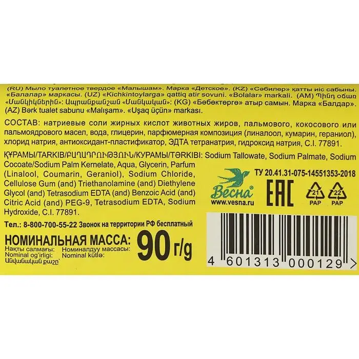 Описание: мыло ДЕТСКОЕ Малышам прекрасно и обильно пенится, не сушит и не раздражает кожу, гипоаллергеное, не имеет практически никакого аромата, легко и быстро вымывается, очищает полностью, удаляет все загрязнения, не оставляет разводов. Мыло предназначено для ежедневного использования, деликатно ухаживает за нежной детской кожей. Детское мыло подходит для детей с рождения.