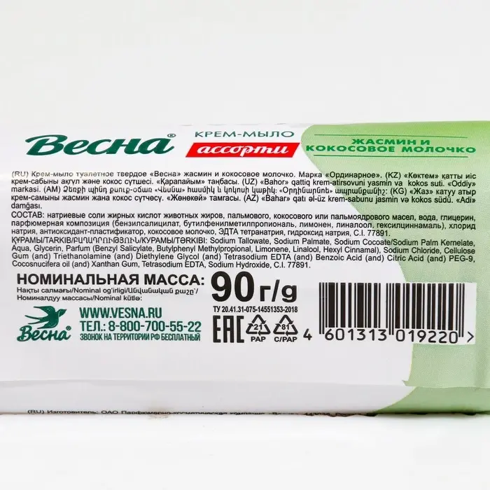 Туалетное мыло ВЕСНА, Ассорти жасмин и кокосовое молочко. Бархатистая текстура мыла легко вспенивается и деликатно очищает кожу, окутывая её нежным ароматом жасмина и кокоса. Нежная пена с легкостью смывается водой, позволяя коже дышать.