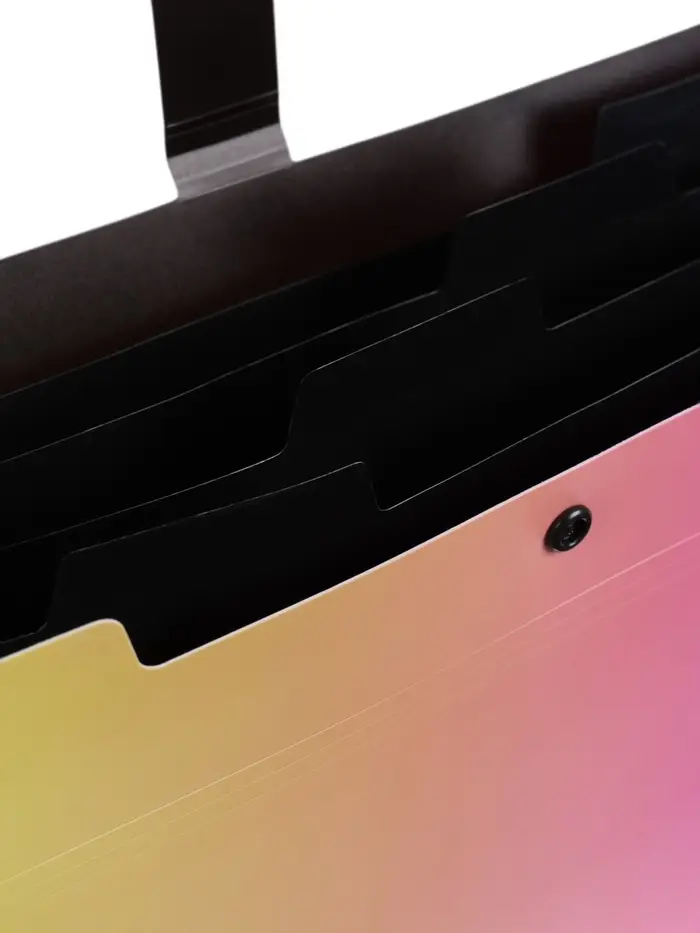 Пять отделений — это пять способов организовать информацию. Можно разделить бумаги по предметам: математика, русский, литература, окружающий мир, английский. Или по проектам: черновики, чистовики, справочные материалы, идеи, готовые работы. Или просто по степени важности. Плотность 600 мкм гарантирует, что папка не помнётся и сохранит форму даже при активном использовании. Кнопка надёжно фиксирует содержимое, но при этом открывается легко и быстро. А яркий жёлто-розовый градиент поднимает настроение и выделяет папку среди других. Это выбор для школьников, студентов и всех, кто работает с большим количеством бумаг и хочет организовать их быстро, красиво и эффективно.