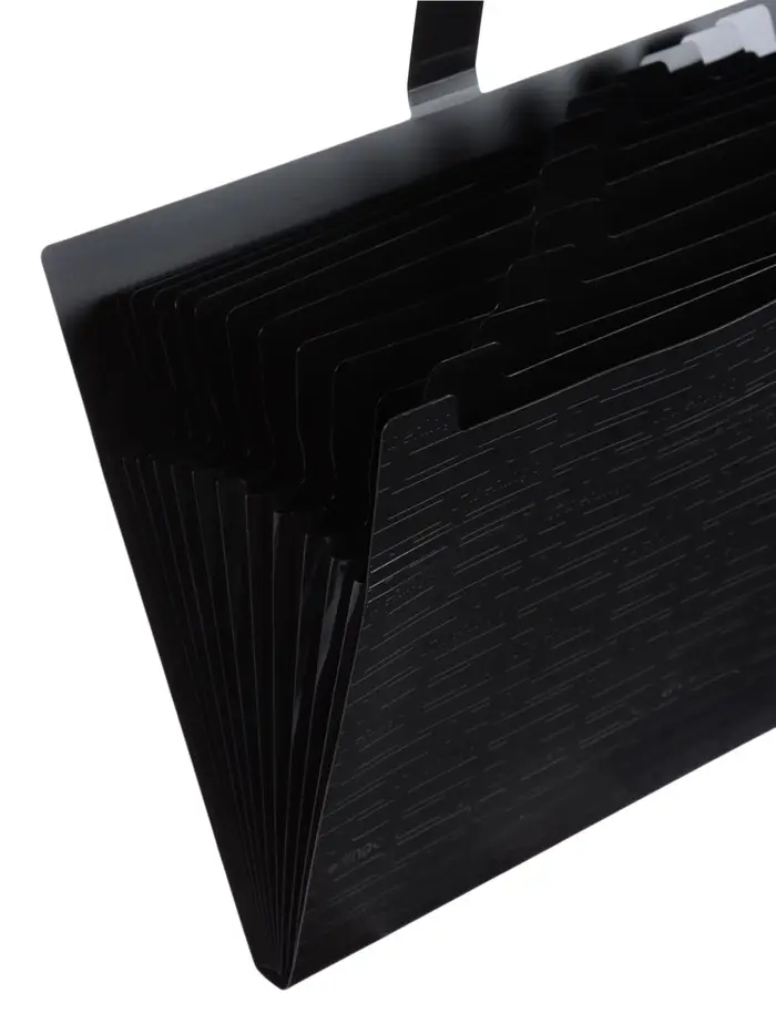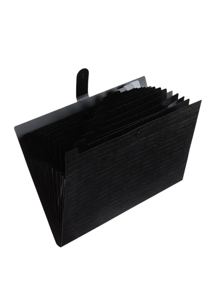 12 отделений — это 12 способов навести идеальный порядок. Можно разделить документы по 12 предметам, по 12 проектам, по 12 клиентам или по 12 месяцам. Такая папка незаменима для тех, кто работает с большим количеством разнородной информации и нуждается в быстром доступе к каждому блоку. Плотность 600 мкм гарантирует, что папка сохранит форму даже при полной загрузке, не помнётся и не деформируется. Чёрный цвет выглядит строго и профессионально, не отвлекая от содержимого. Кнопка надёжно фиксирует все отделения, но при этом открывается легко и быстро. Это выбор для студентов, преподавателей, юристов, бухгалтеров и всех, для кого порядок в документах — не просто слово, а необходимое условие эффективной работы.