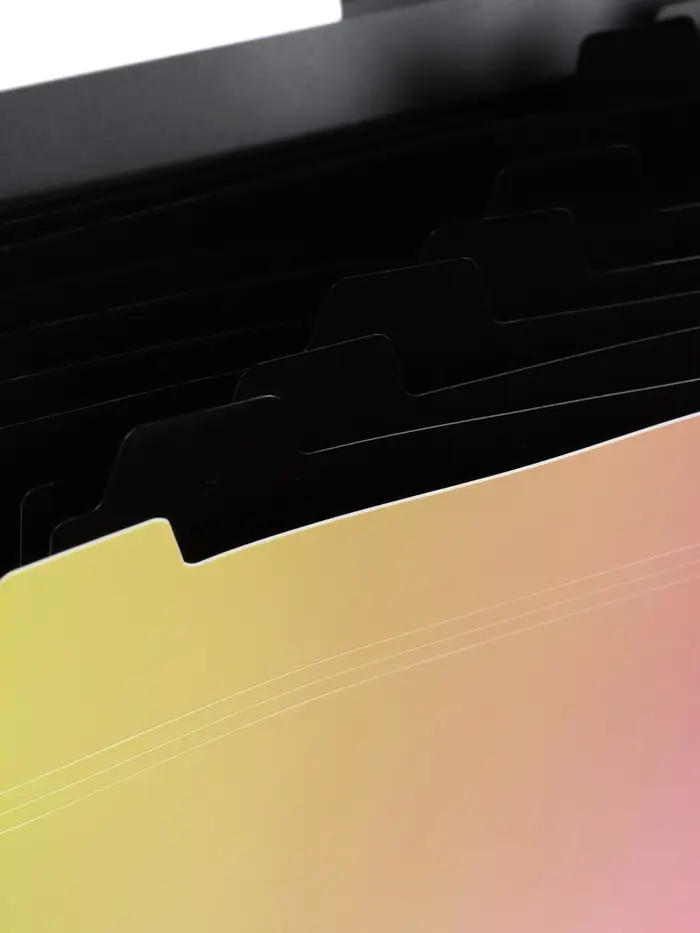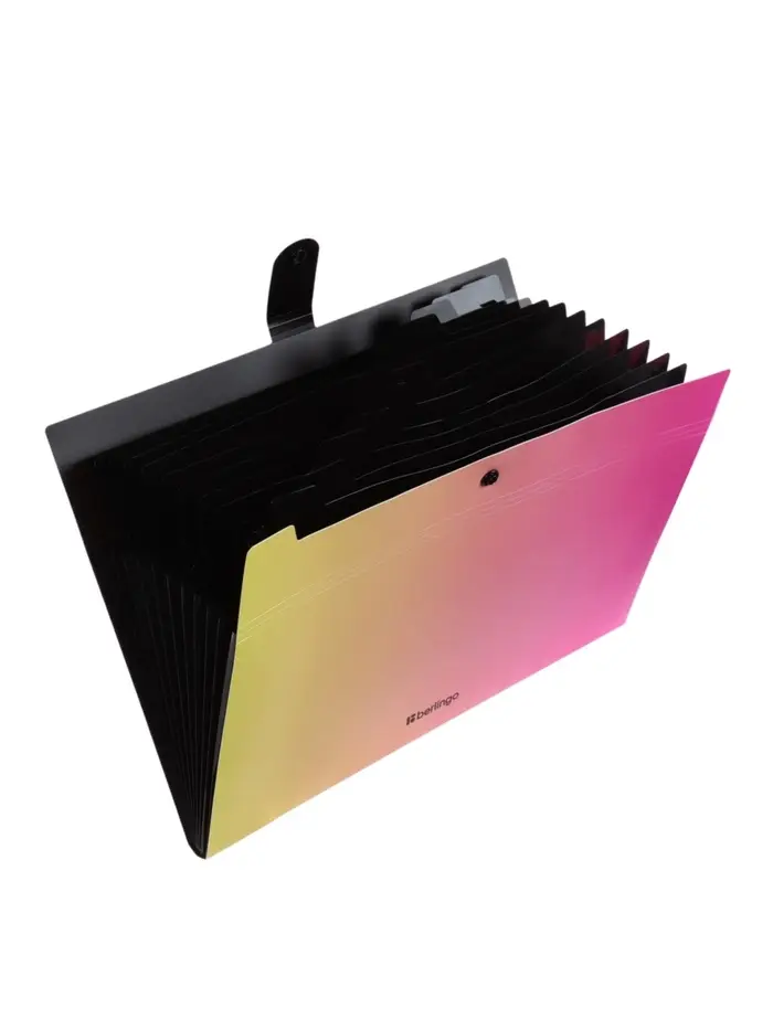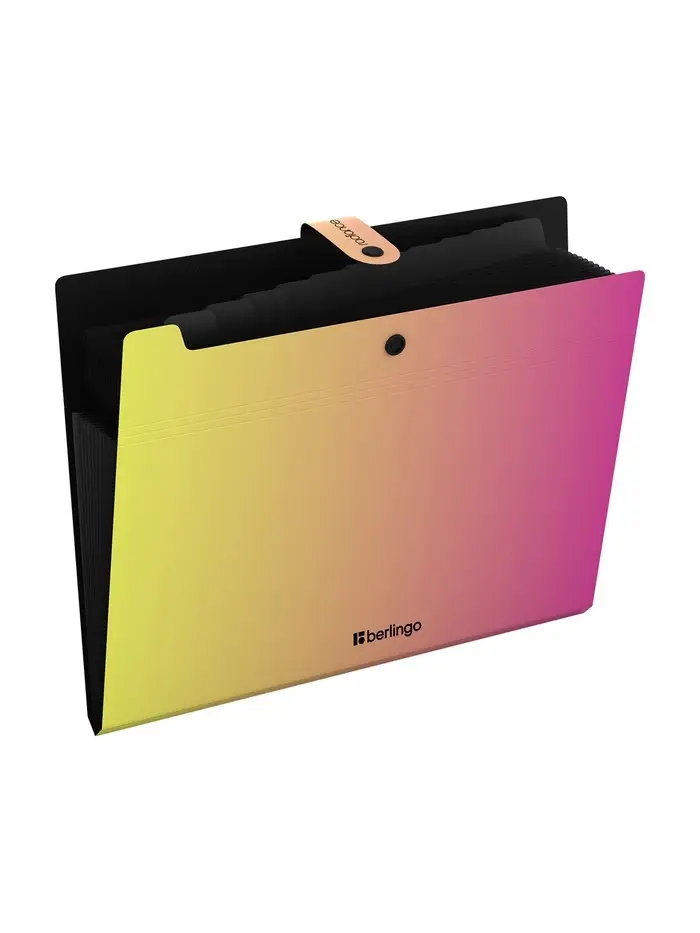 Жёлто-розовый градиент — это воплощение энергии, оптимизма и радости. Такая папка не просто хранит документы, она поднимает настроение каждый раз, когда вы берёте её в руки. 12 отделений — это максимум возможностей для организации информации. Можно разделить бумаги по 12 предметам, по 12 проектам, по 12 месяцам или по 12 категориям. Плотность 600 мкм гарантирует, что папка сохранит форму даже при полной загрузке, не помнётся и не деформируется. Кнопка надёжно фиксирует все отделения, но открывается легко и быстро. Это выбор для студентов, творческих людей и всех, кто хочет, чтобы даже рабочие инструменты приносили радость и вдохновляли на новые свершения. Порядок в документах и отличное настроение — что может быть лучше?