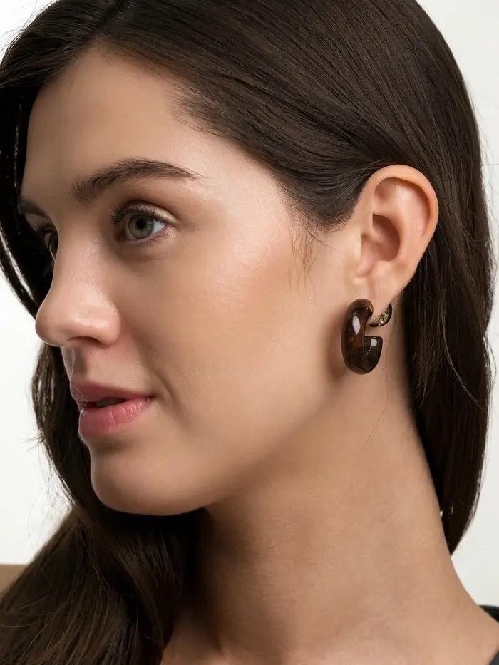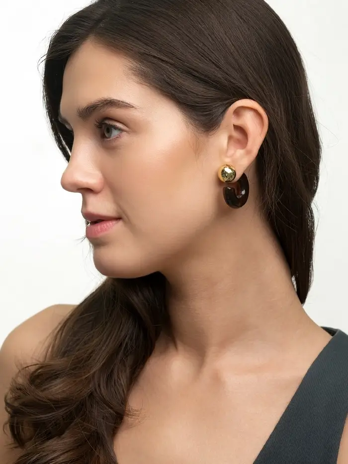 Серьги «Полукольцо с бусиной №14» — это стильный аксессуар, который сочетает в себе природную эстетику и современный дизайн. Глубокий коричневый цвет с эффектными разводами имитирует фактуру натурального камня, придавая украшению благородный и теплый вид.