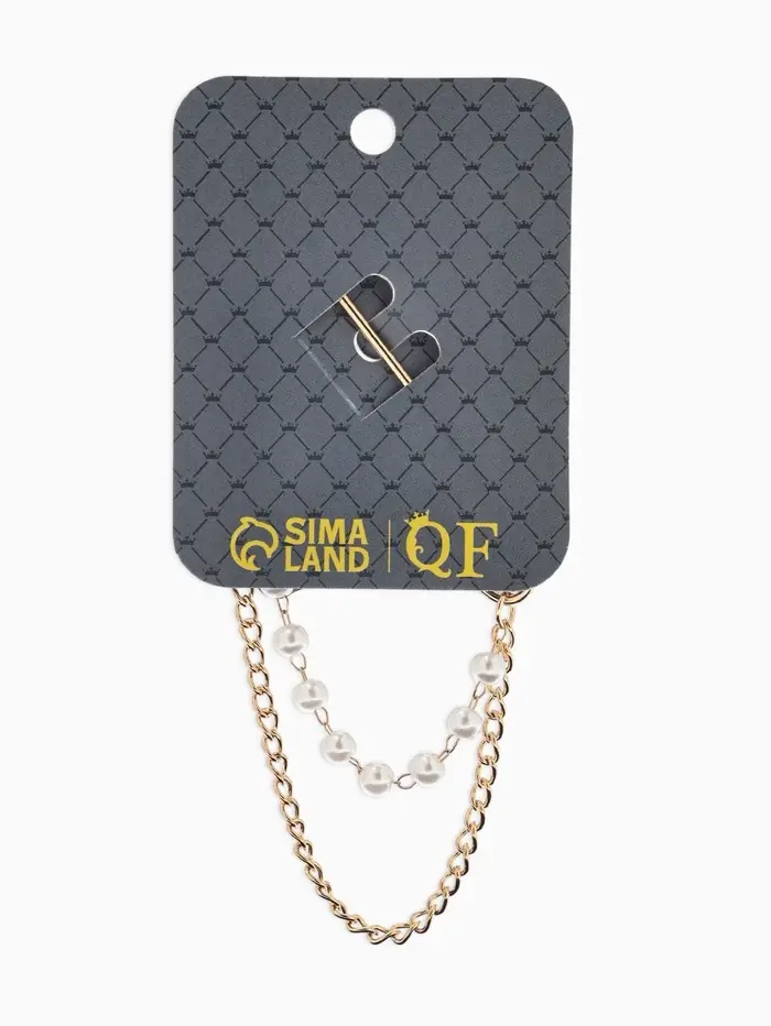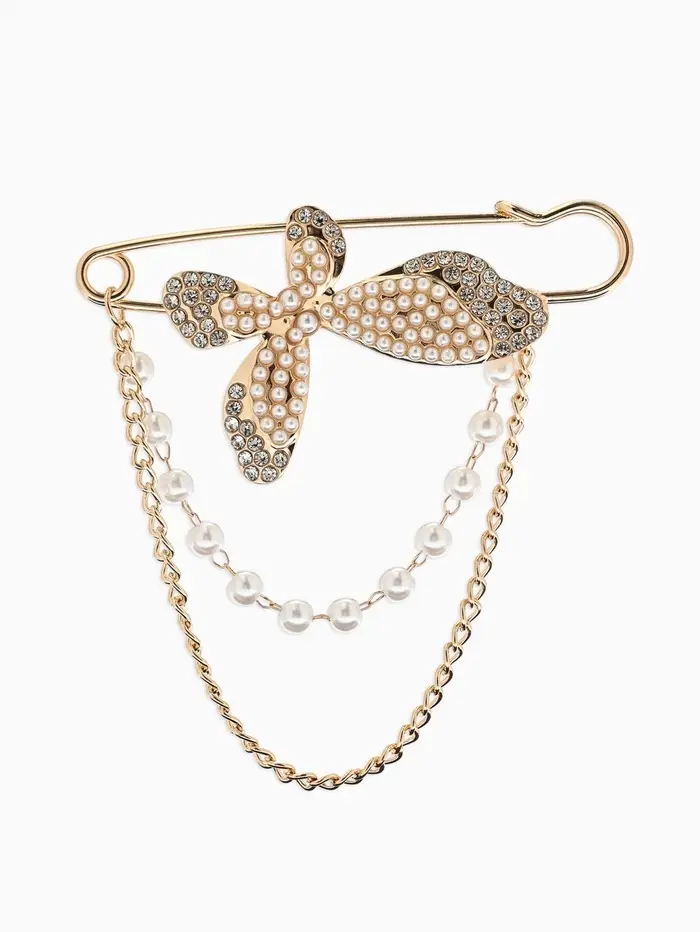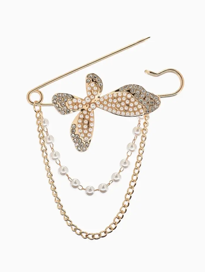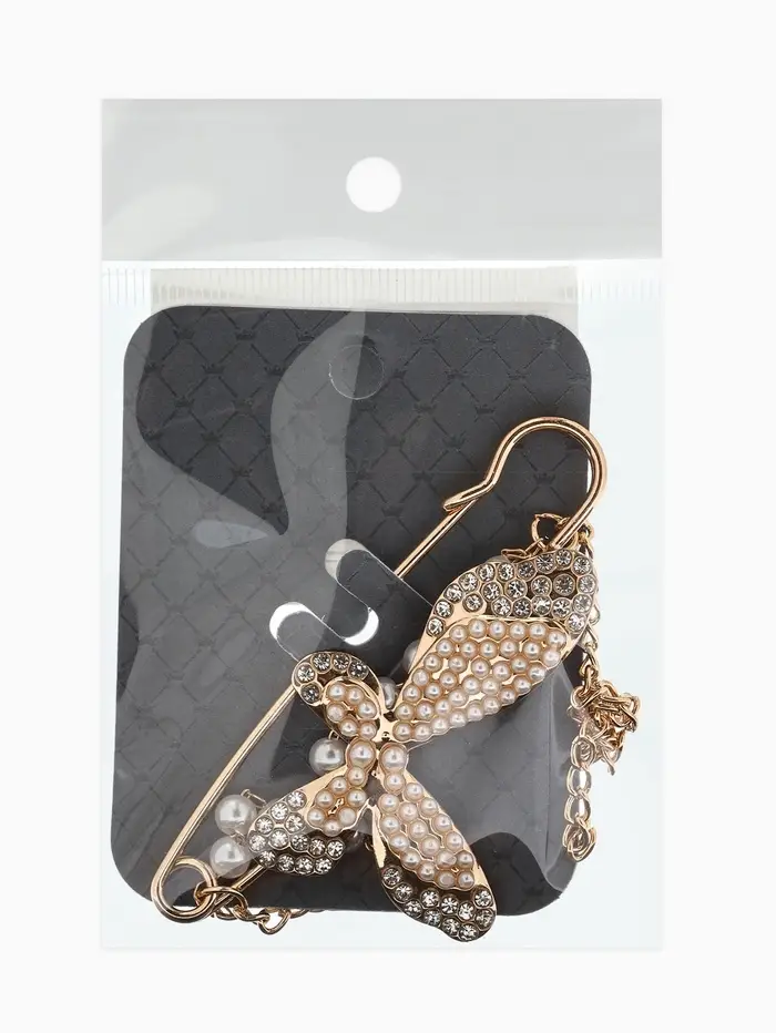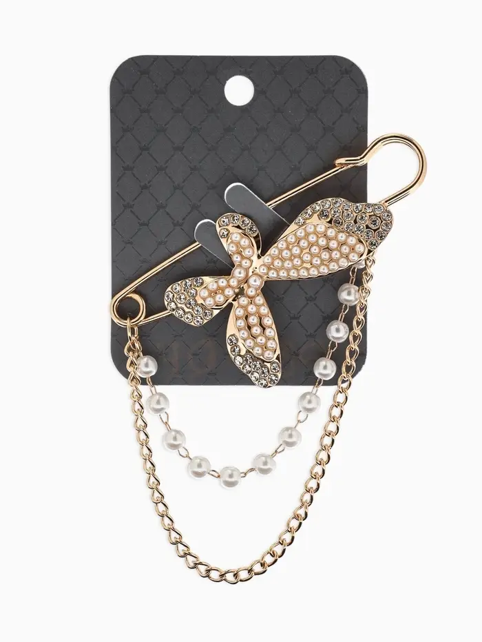 Булавка «Бабочка» в стразах, цепочка, жемчуг, L=7.5 см, цвет белый в золоте