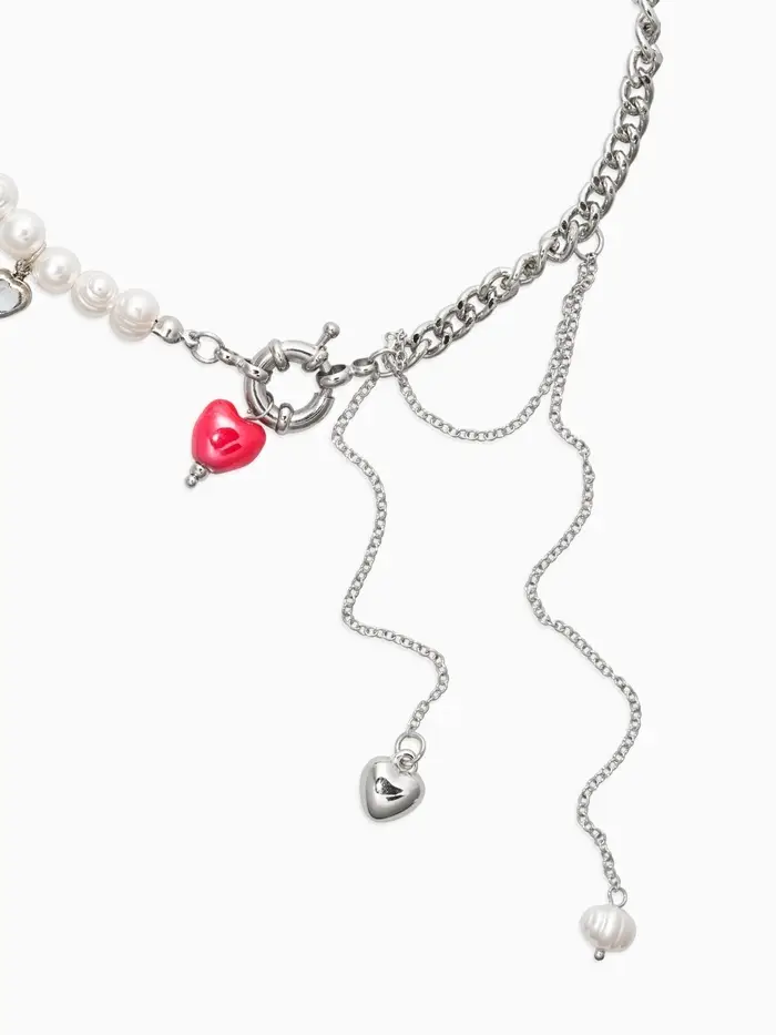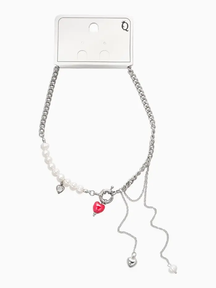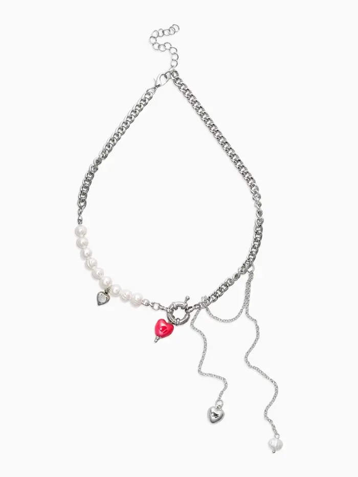 Колье «Сердце» керамика, на цепочке с жемчугом, цвет красно-белый в серебре, L=35+7см