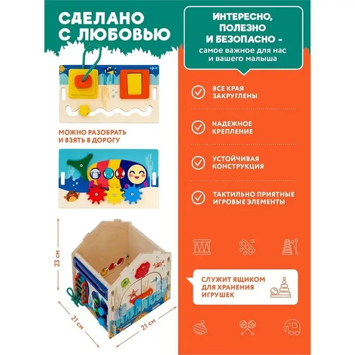 Бизидом оснащён множеством функциональных элементов: замочки, вертушки, шестерёнки, лабиринты и многое другое, что способствует развитию мелкой моторики, логического мышления и творческих способностей. Он идеально подходит для детей от 3 лет и старше. Закажите бизидом сегодня и подарите своему ребёнку радость познания и творчества!
