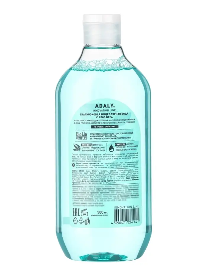 Вода гиалуроновая мицеллярная Adaly, с алоэ вера, 500 мл
