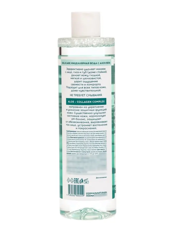Удобный флакон объёмом 500 мл обеспечивает экономичный расход средства, а его использование не требует обязательного смывания после очищения. Это делает мицеллярную воду Delicare универсальным средством для ухода за кожей, которое легко вписывается в повседневную бьюти‑рутину.