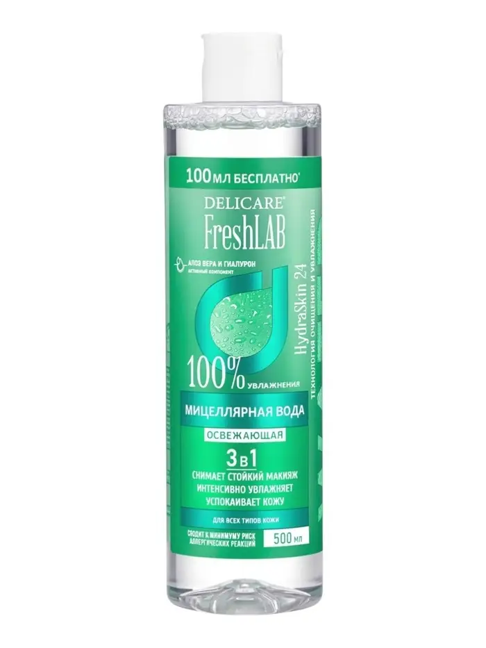 Экстракт алоэ в составе обладает натуральными успокаивающими и смягчающими свойствами. Он помогает поддерживать оптимальный уровень увлажнения, снижает ощущение стянутости и сухости после очищения и способствует более мягкому и комфортному ощущению кожи. Благодаря этому мицеллярная вода Delicare подходит для всех типов кожи, включая чувствительную.