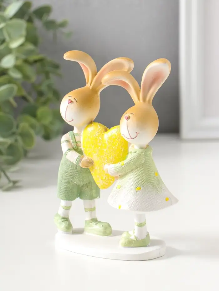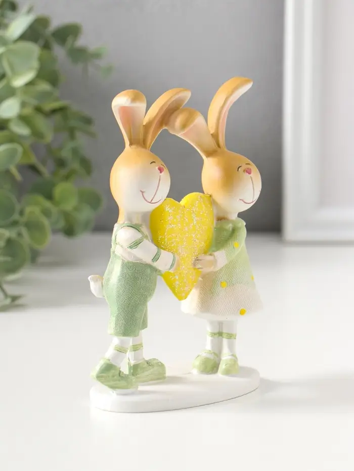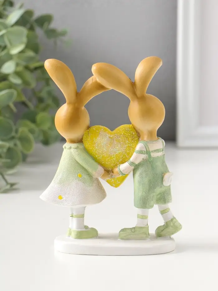 Сувенир полистоун "Зайки-малыши в зелёных нарядах, с большим жёлтым сердцем" 13,5 см