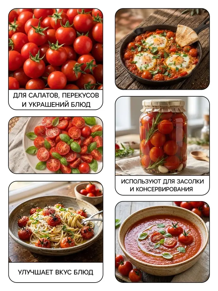 - Универсальность использования: сладкие черри идеально подходят для свежих салатов, украшения блюд, закусок. Благодаря мелкому размеру и плотной кожице, их также можно консервировать целиком и использовать для вяления.