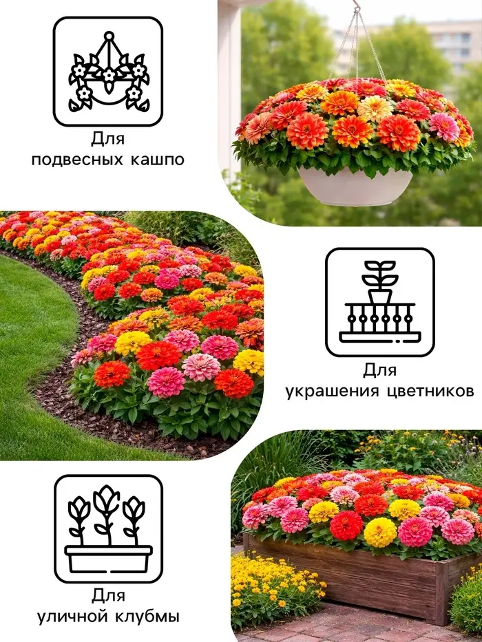 Для создания ярких, жизнерадостных композиций: цинния «Карусель» - это идеальный выбор для тех, кто хочет наполнить сад энергией и позитивом. Ее пестрые, махровые соцветия создают праздничное настроение и притягивают взгляды. Простота выращивания, богатство оттенков и продолжительное цветение делают этот сорт фаворитом среди садоводов.