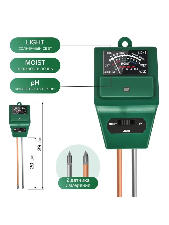 Измеритель параметров почвы 3 в 1 позволяет определить влажность, уровень pH (кислотность) и освещённость почвы. Подходит для комнатных растений, рассады, теплиц и открытого грунта. Помогает контролировать условия выращивания без использования батареек.