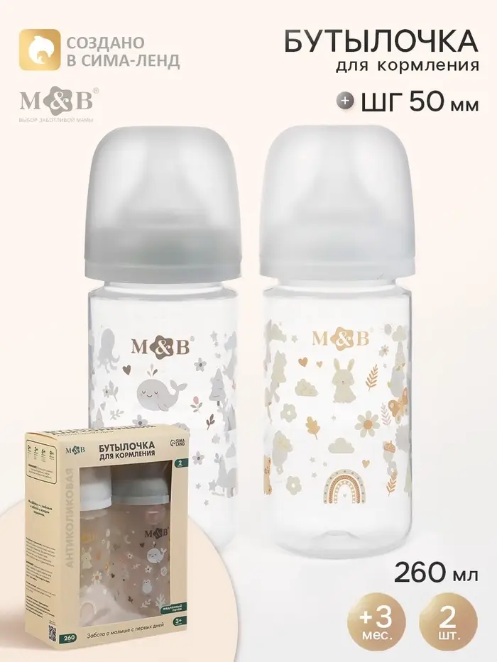 Бутылочка для кормления, широкое горло Ø50 мм, +3мес., 260 мл, набор 2 шт. M&B