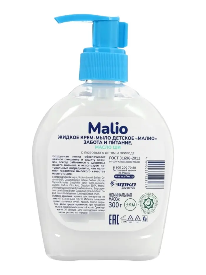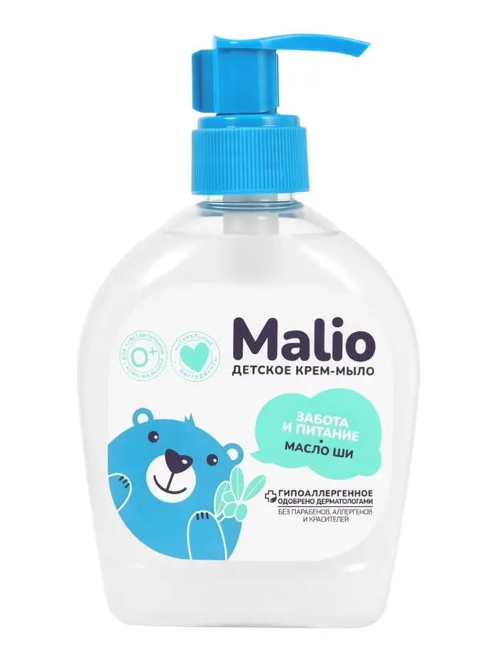Удобная упаковка объёмом 300 мл обеспечивает экономичный расход средства и простоту использования дома и в поездках. Крем-мыло «Малио» с маслом ши — это ежедневная забота о коже ребёнка, мягкость, увлажнение и комфорт при каждом купании, а также защита от сухости и дискомфорта.