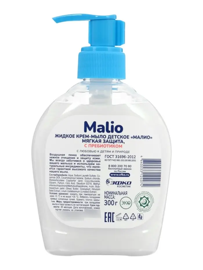 Компактная упаковка объёмом 300 мл удобна для домашнего использования и поездок, обеспечивая экономичный расход средства. Крем-мыло «Малио» мягкая защита с пребиотиком — это надёжная забота о коже ребёнка, поддержка её естественного баланса, мягкость и увлажнение каждый день.