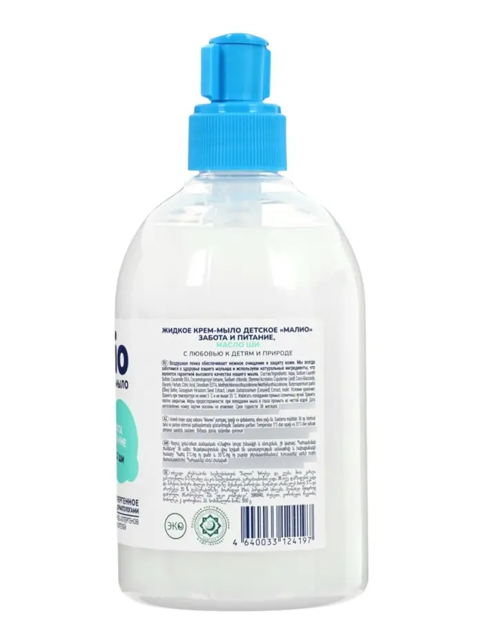 Удобная упаковка объёмом 500 мл с дозатором обеспечивает экономичный расход средства и простоту использования дома. Крем-мыло «Малио» с маслом ши — это ежедневная забота о коже ребёнка, мягкость, увлажнение и комфорт при каждом купании, а также надёжная защита от сухости и раздражений.