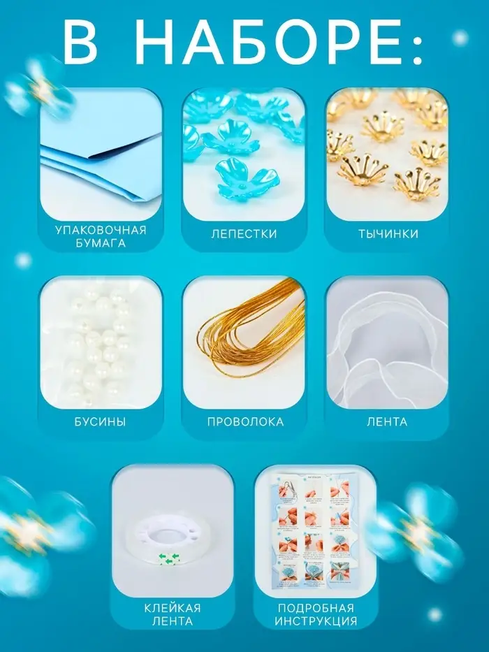 В комплект входят все необходимые элементы для сборки цветов. Используя проволоку и бусины, вы сможете создать утонченный букетик, который станет красивым украшением и будет долго радовать своим видом.