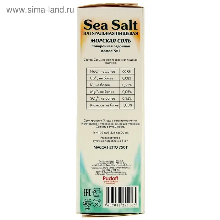 Соль морская Пудофф Marbelle средняя, помол №1, 750 г