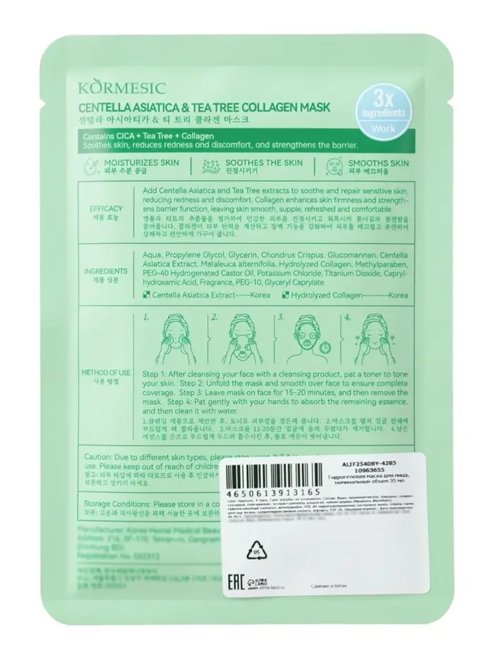 Вода, пропиленгликоль, глицерин, хондрус курчавый, глюкоманнан, экстракт центеллы азиатской, чайное дерево (Melaleuca alternifolia), гидролизованный коллаген, метилпарабен, ПЭГ-40 гидрогенизированное касторовое масло, хлорид калия, диоксид титана, каприлгидроксамовая кислота, отдушка, ПЭГ-10, глицерилкаприлат.