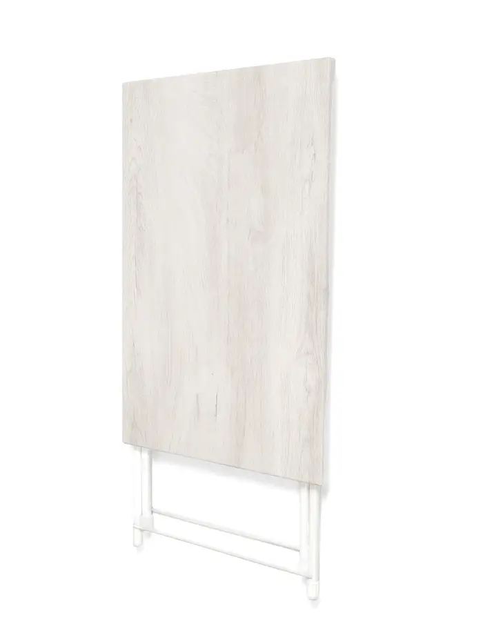 Столешница из МДФ выполнена в благородном оттенке «дуб дымчатый» с фактурой под натуральное дерево, что придаёт изделию эстетичный внешний вид. Матовый белый каркас обеспечивает прочность и устойчивость конструкции. Модель имеет 2 положения высоты – 50 см и 62 см, позволяя адаптировать стол под различные задачи.