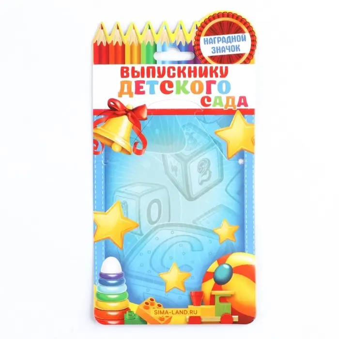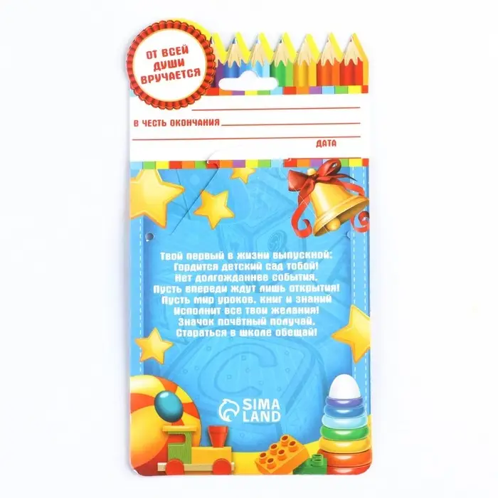 Выпускной - это особое событие для каждого ребёнка. Сувенир изготовлен из лёгкого пластика и декорирован яркой текстильной лентой шириной 1,8 см. Изделие дополнено булавкой на оборотной стороне, так что его сразу можно надеть на счастливого получателя. Каждый значок на булавке с лентой прикреплен к яркой, нарядной подложке - открытке, ребенку будет вдвойне приятно получить такой презент