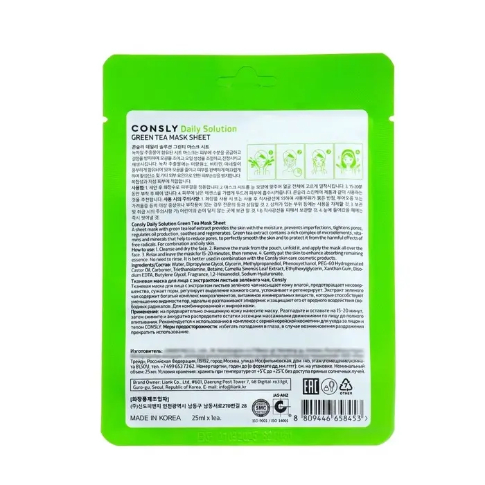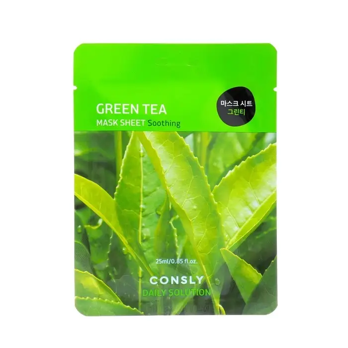 Тканевая маска Consly для лица с экстрактом листьев зелёного чая и объемом 25 мл - это уходовый продукт, который содержит экстракт зелёного чая, известный своими антиоксидантными и успокаивающими свойствами для кожи.