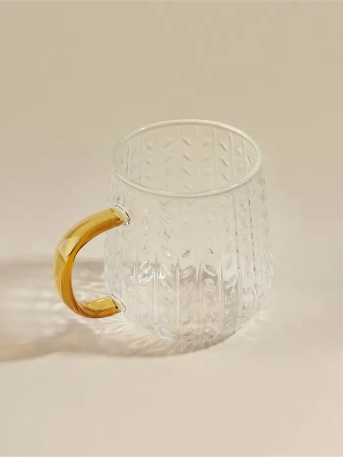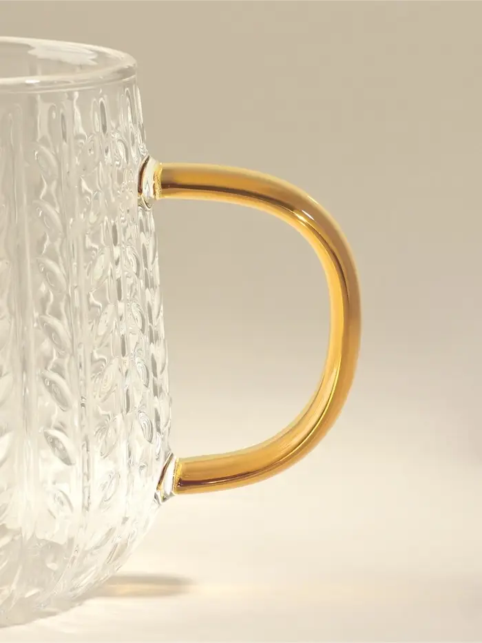 Эта прозрачная стеклянная кружка с рельефным узором и яркой жёлтой ручкой станет вашим любимым сосудом для утреннего кофе или вечернего чая. Её форма, напоминающая спелый колос пшеницы, создаёт особое ощущение тепла и уюта, наполняя каждый день природной гармонией.