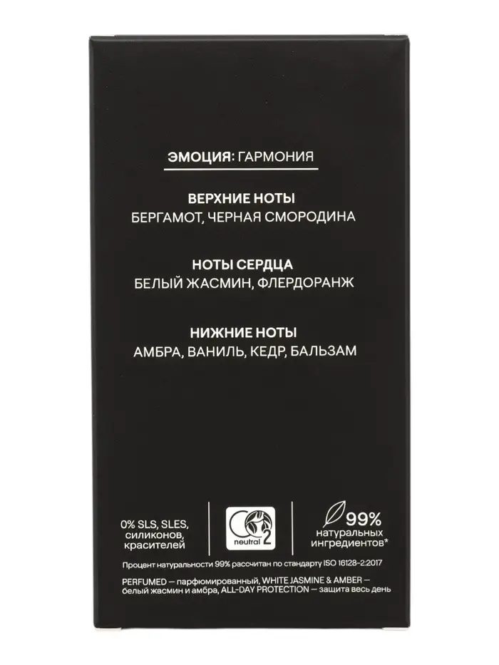 Дезодорант легко наносится, быстро высыхает, не оставляя липкости и следов на одежде. Селективный аромат «Белый жасмин и амбра» оставляет утончённый шлейф, который не перебивает парфюм. Умные аромамолекулы Scentease™ создают ощущение спокойствия, внутренней гармонии и уверенности в себе.