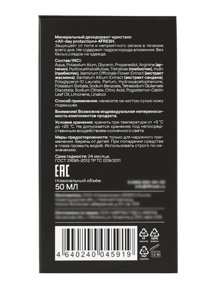 Минеральный дезодорант-кристалл 4FRESH all-day protection, 50 мл