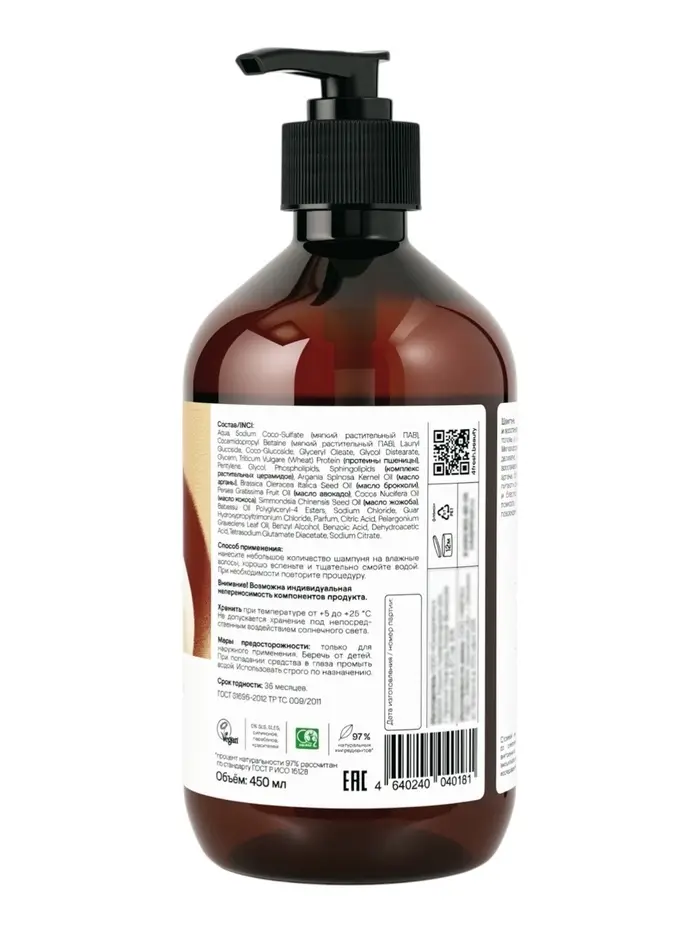 Aqua, Sodium Coco-Sulfate, Cocamidopropyl Betaine, Lauryl Glucoside, Coco-Glucoside, Glyceryl Oleate, Glycol Distearate, Glycerin, Triticum Vulgare (Wheat) Protein, Pentylene Glycol, Phospholipids, Sphingolipids, Argania Spinosa Kernel Oil, Brassica Oleracea Italica Seed Oil, Persea Gratissima Fruit Oil, Cocos Nucifera Oil, Simmondsia Chinensis Seed Oil, Babassu Oil Polyglyceryl-4 Esters, Sodium Chloride, Guar Hydroxypropyltrimonium Chloride, Parfum, Citric Acid, Pelargonium Graveolens Oil, Benzyl Alcohol, Benzoic Acid, Dehydroacetic Acid, Tetrasodium Glutamate Diacetate, Sodium Citrate.