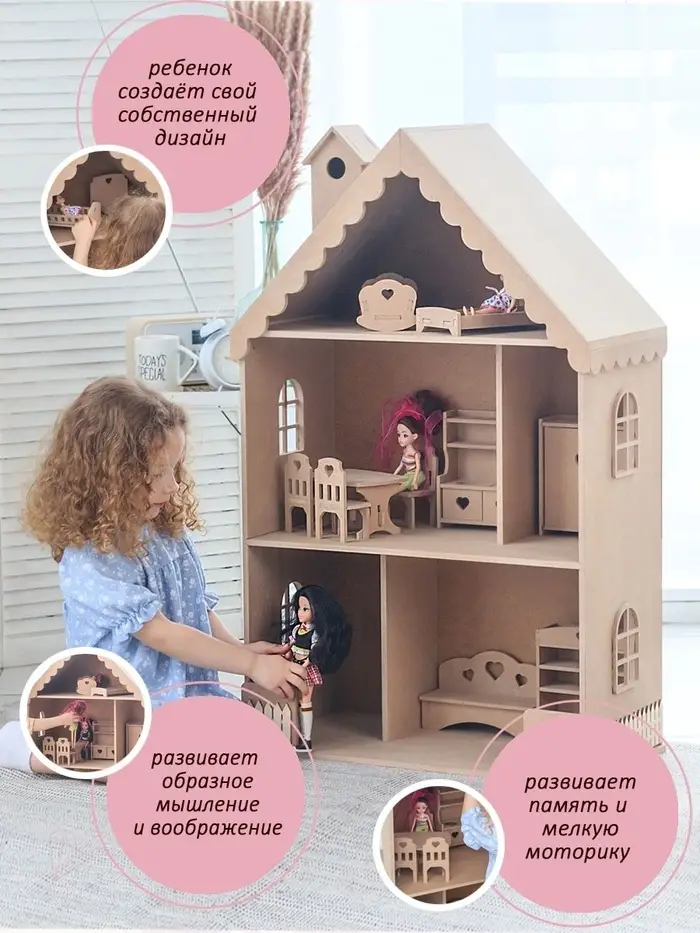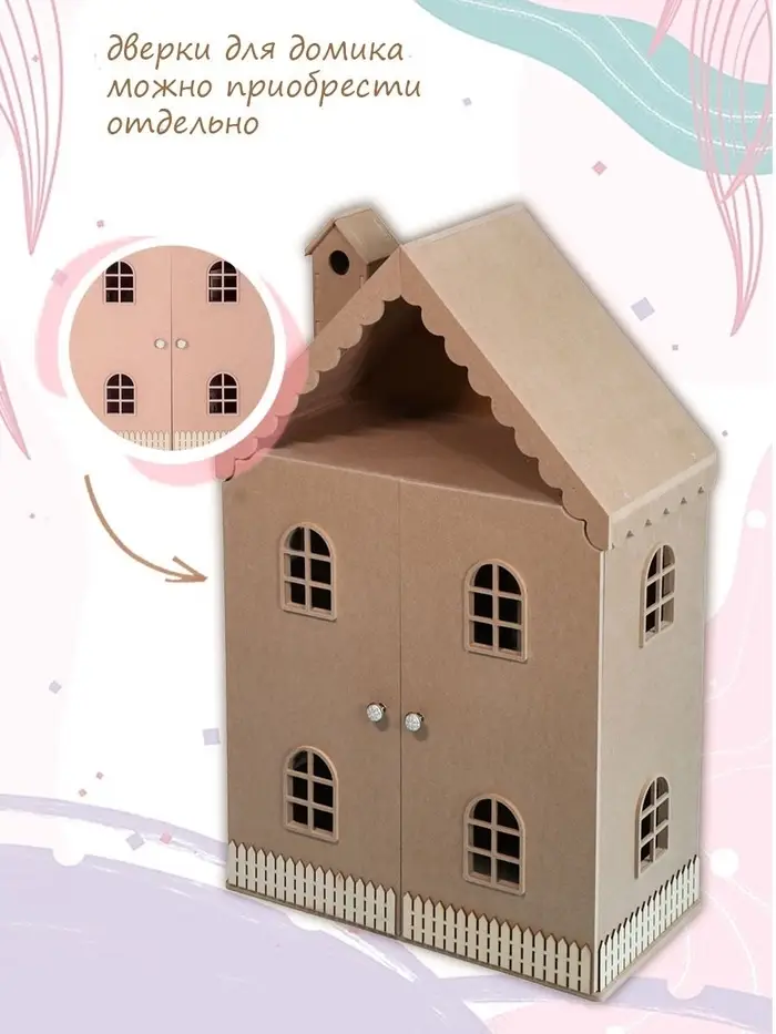 Для кого? Модель подходит детям от 3 лет — тем, кто начинает создавать собственные игровые истории и ищет пространство, где игрушки «живут». Домик приходит в плотной картонной коробке, удобной для хранения и дарения. Это спокойный, продуманный подарок для девочки, которая любит куклы, интерьерные миниатюры и творческие эксперименты.