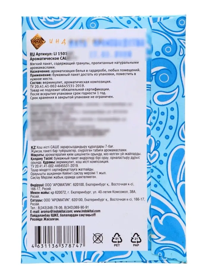 Разместите саше в шкафу, комоде, сумке или автомобиле. Извлекать содержимое упаковки не нужно — аромат постепенно распространяется сквозь тканевый пакетик.
