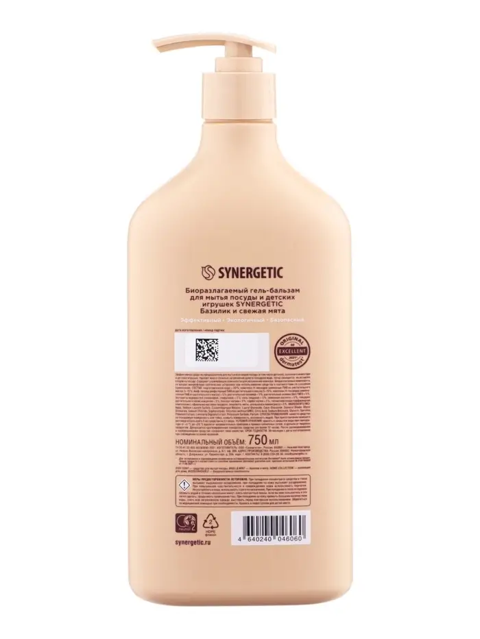 Гель-бальзам для мытья посуды SYNERGETIC базилик и свежая мята, 750 мл