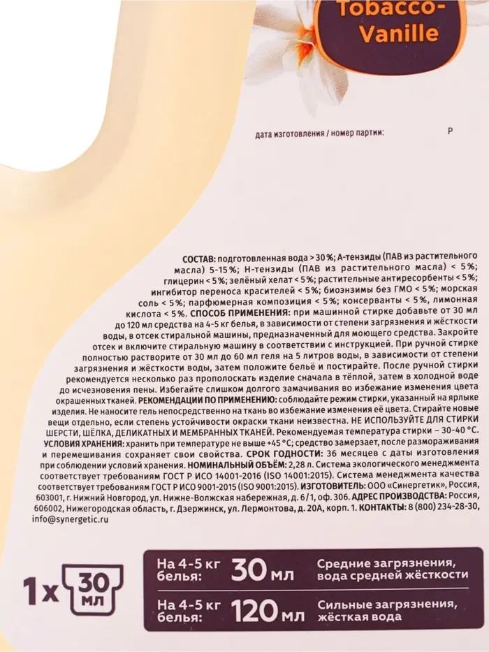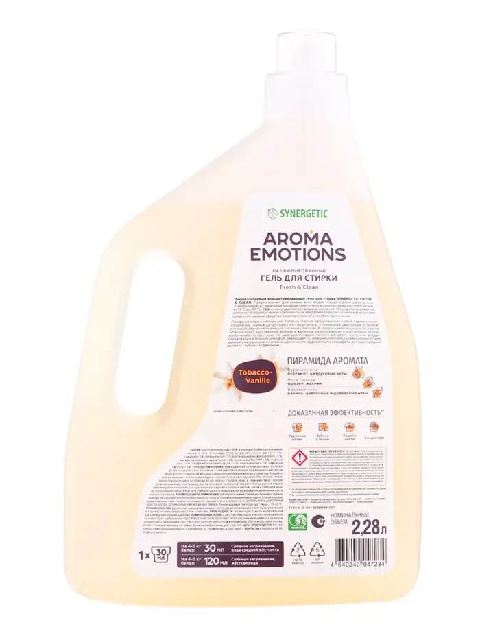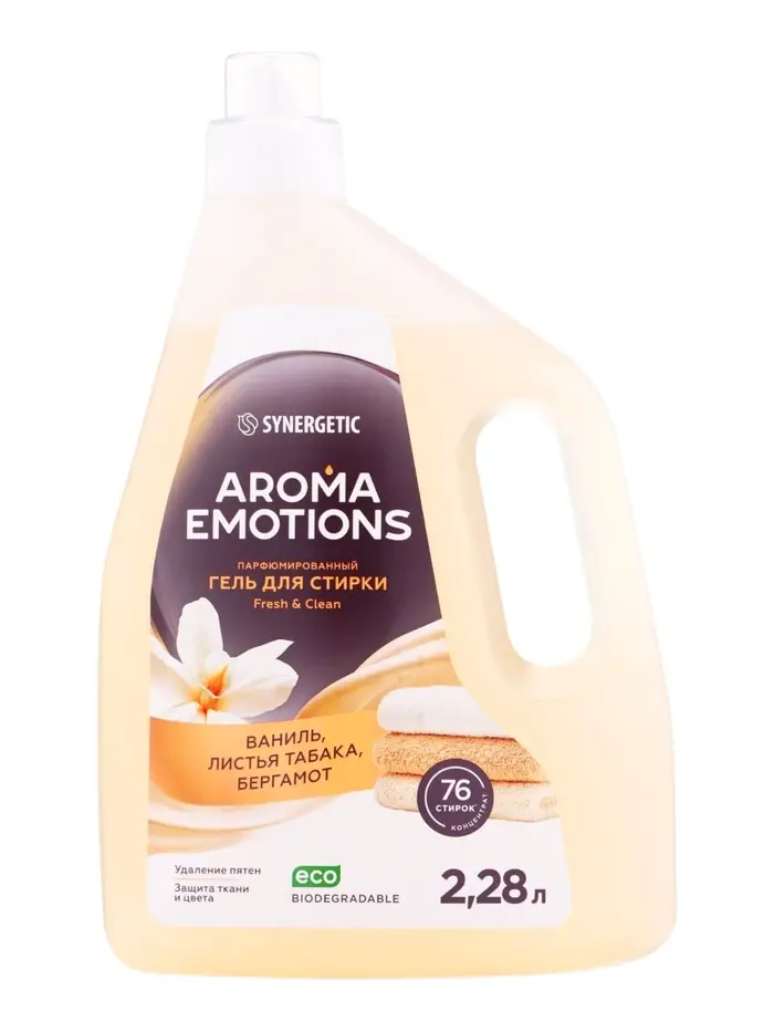 Гель для стирки белья парфюмированный SYNERGETIC ваниль, табак, бергамот, 2,28 л