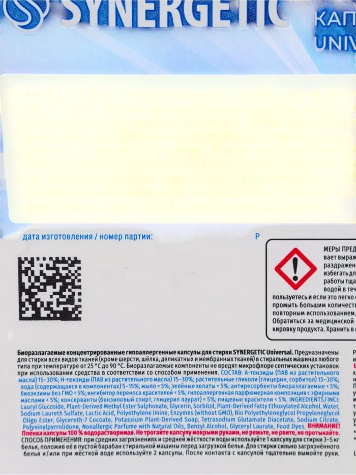 Капсулы для стирки белья универсальные SYNERGETIC бескрайний океан, 18 шт