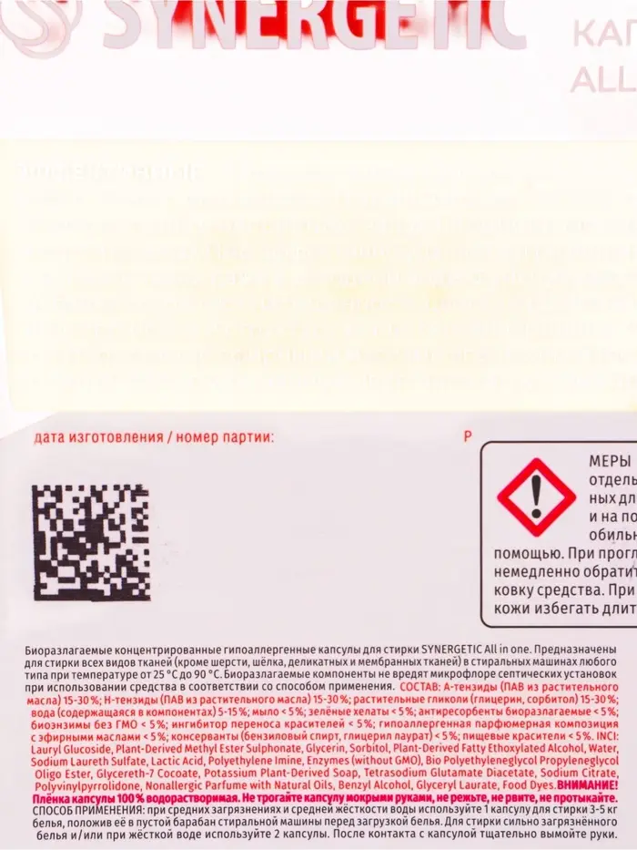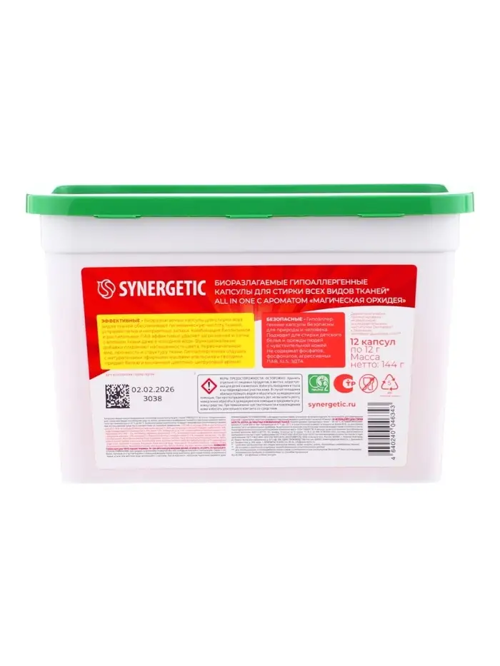 Капсулы для стирки белья биоразлагаемые SYNERGETIC ALL IN ONE гипоаллергенные, 12 шт