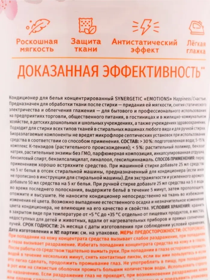 Кондиционер для белья парфюмированный SYNERGETIC миндаль, груша, жасмин, 0,9 л