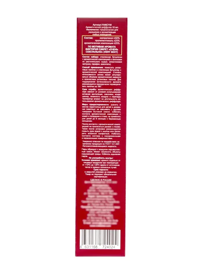 Создайте в своём доме атмосферу соблазна и утончённой элегантности с аромадиффузором FANCY по мотивам аромата Виктория Сикрет "Очень сексуально", 50 мл. Этот диффузор наполняет пространство мягким, чарующим ароматом, который сочетает в себе ноты чувственности, тепла и изысканности, повторяя атмосферу знаменитого парфюма.