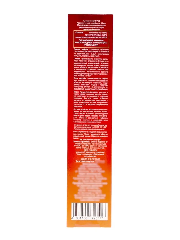 - Аромат по мотивам Кристиан Диор "Фаренгейт" — уникальная композиция с нотами древесины и пряностей создаёт мужественную, стойкую и привлекательную атмосферу. Диффузор наполняет пространство энергией и элегантностью.