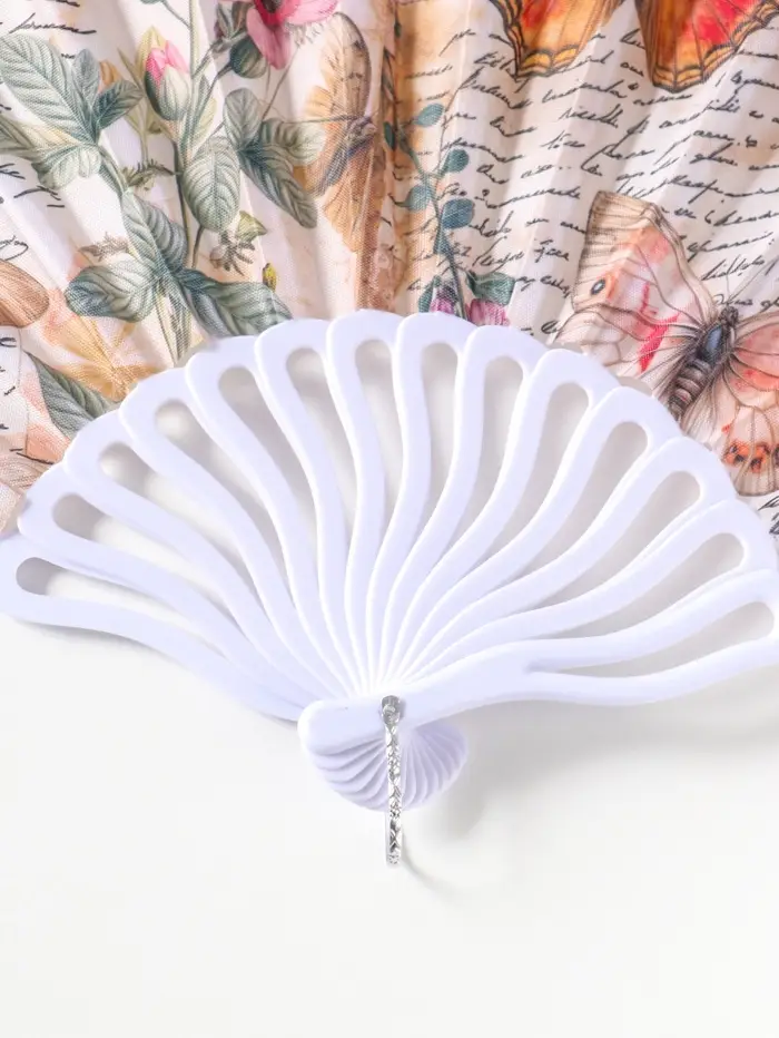 Веер раскрывается одним движением, предлагая не только желанную прохладу, но и эстетическое удовольствие. Художественная композиция из бабочек и цветов на фоне газетной текстуры создаёт настроение лёгкой ностальгии. Это больше, чем просто веер — это небольшое произведение искусства для ваших рук, которое говорит об утончённом вкусе своей владелицы.