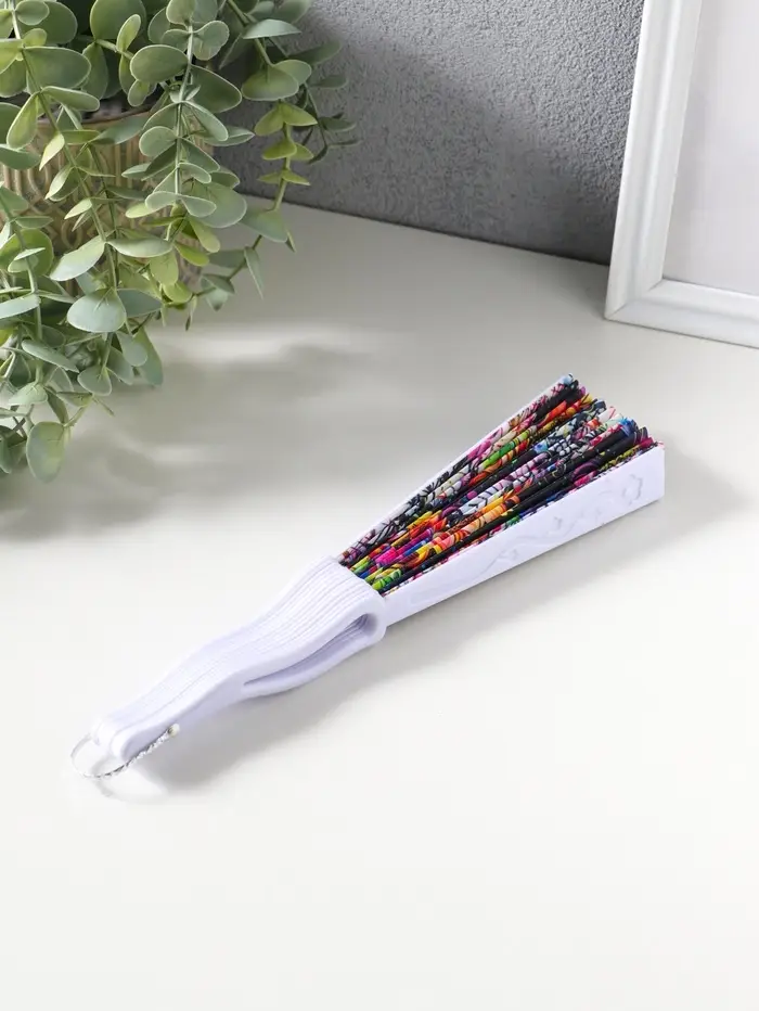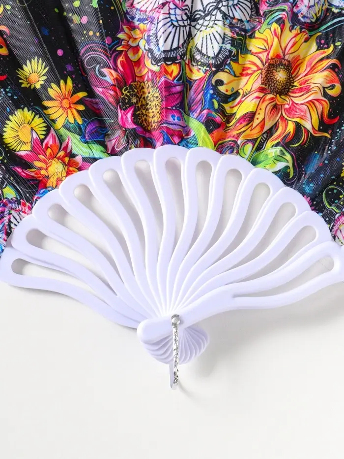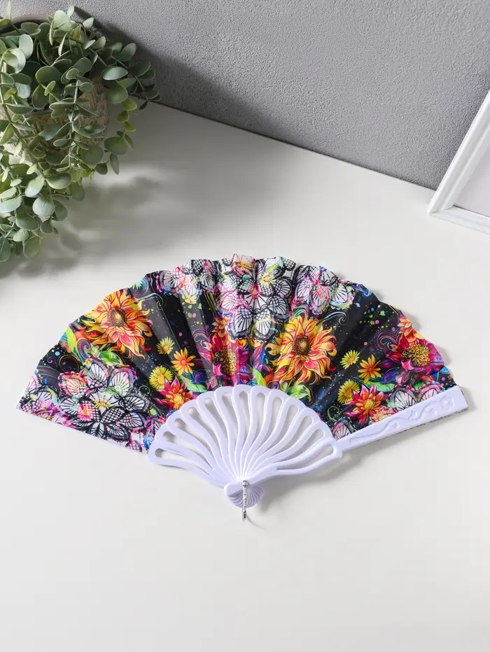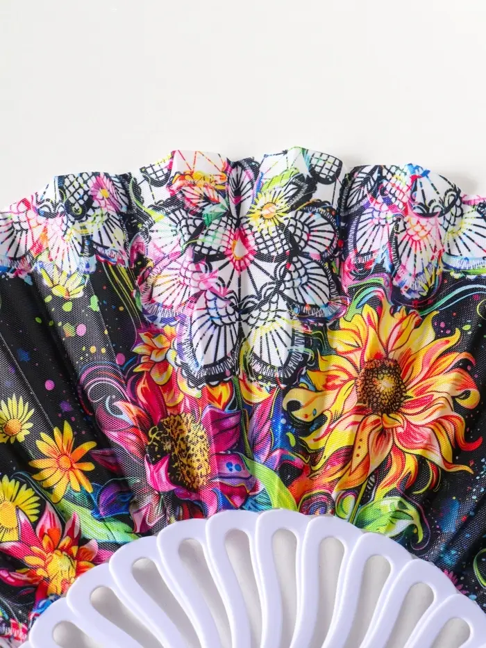 Этот складной веер с ярким цветочным узором — стильный аксессуар для жарких дней. Он легко помещается в сумку, создавая личную прохладу в душном транспорте, на прогулке или в кафе. Узор в стиле мехенди и солнечные подсолнухи поднимают настроение, превращая обычный веер в элемент летнего образа.