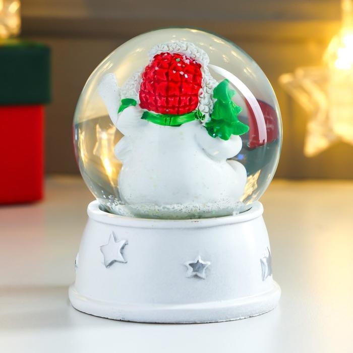 Сувенир полистоун водяной шар "Снеговик в шапке-ушанке, с ёлкой" d=6,5 см 8х6,5х6,5 см