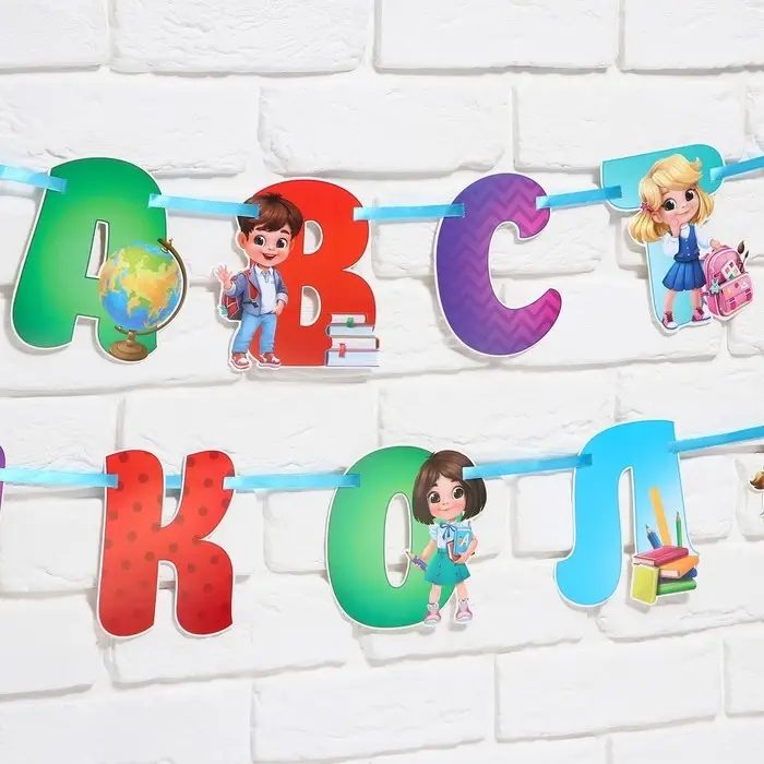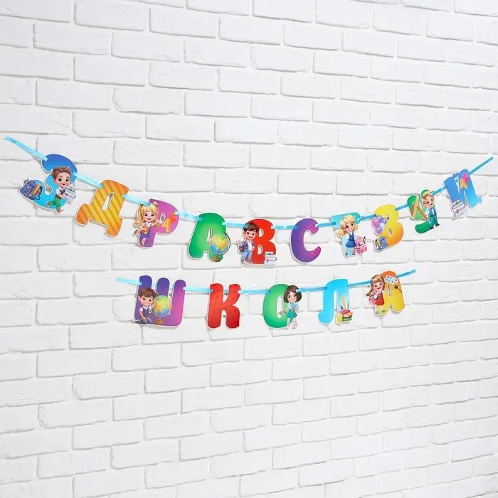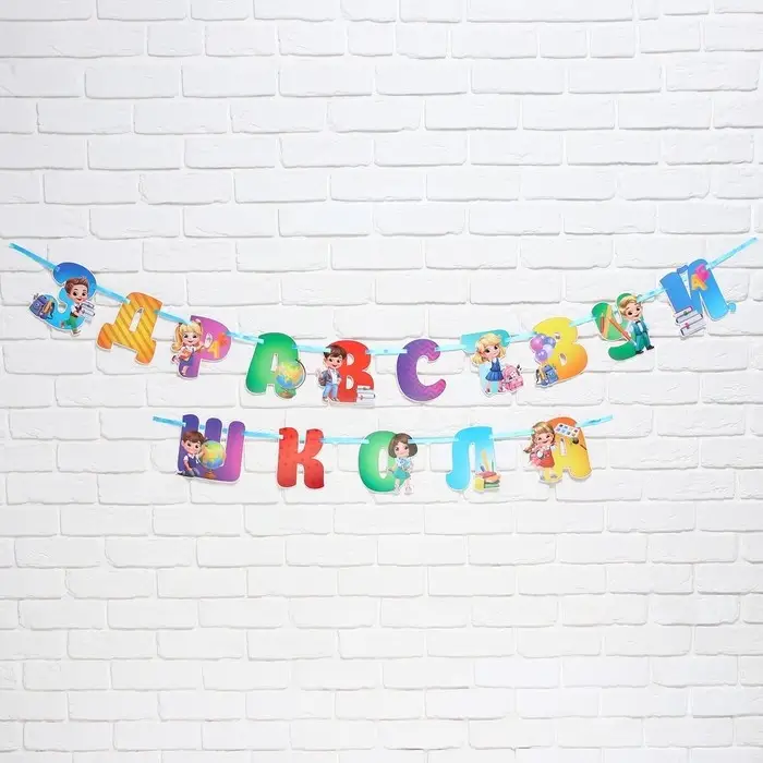 Гирлянда на ленте понадобится вам для украшения учебного класса или зала. Буквы идут в комплекте с лентой которую можно удобно закрепить на булавки (в комплект не входят). Изделие поставляется в пакете с яркой дизайнерской подложкой.