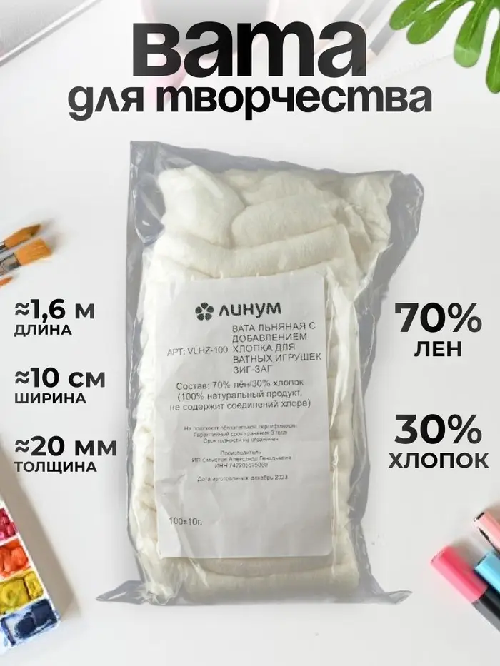 Вата, Артикул VLHZ-100, 100 грамм, лента зиг-заг, лён/хлопок, 70 шт. в коробе