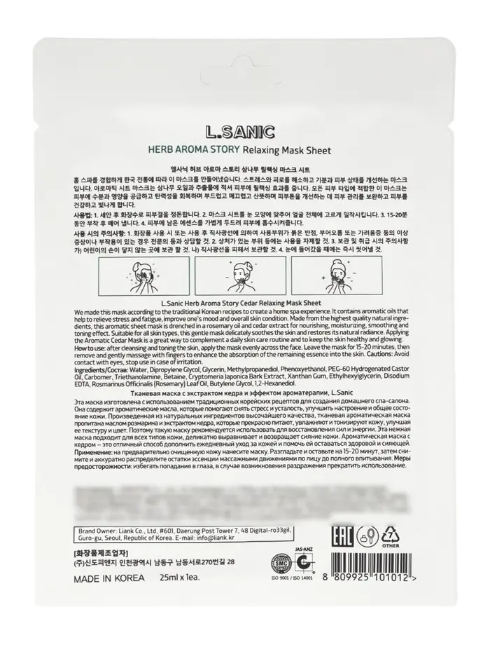 Тканевая маска с экстрактом кедра и эффектом ароматерапии, 25мл, L.Sanic