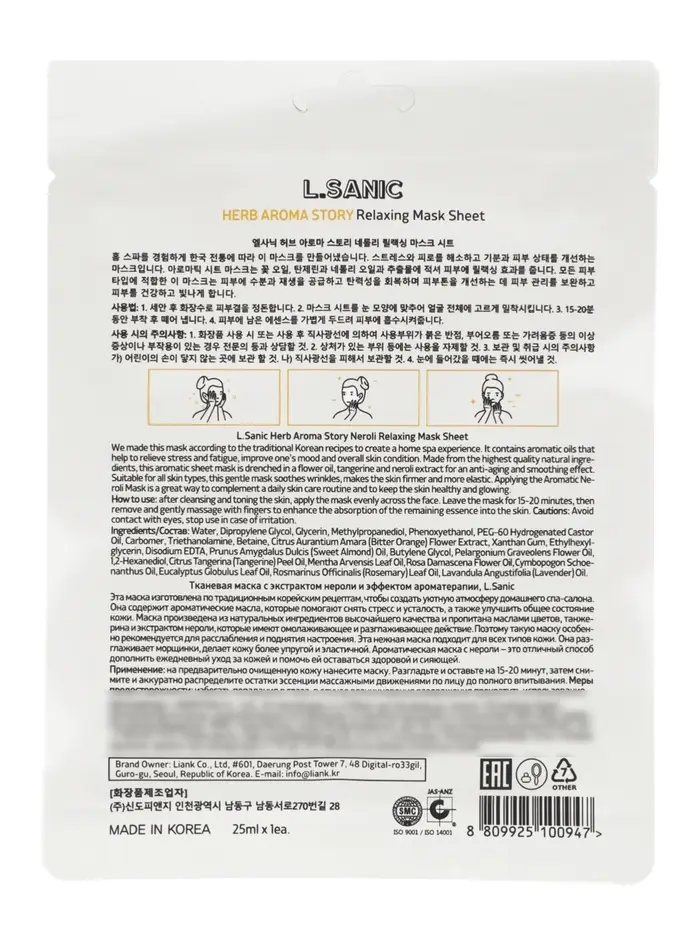 Тканевая маска с экстрактом нероли и эффектом ароматерапии, 25мл, L.Sanic