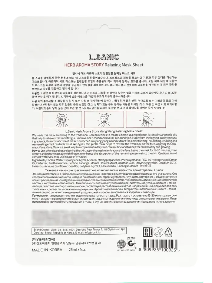 Тканевая маска с экстрактом цветков иланг-иланга и эффектом ароматерапии, 25мл, L.Sanic