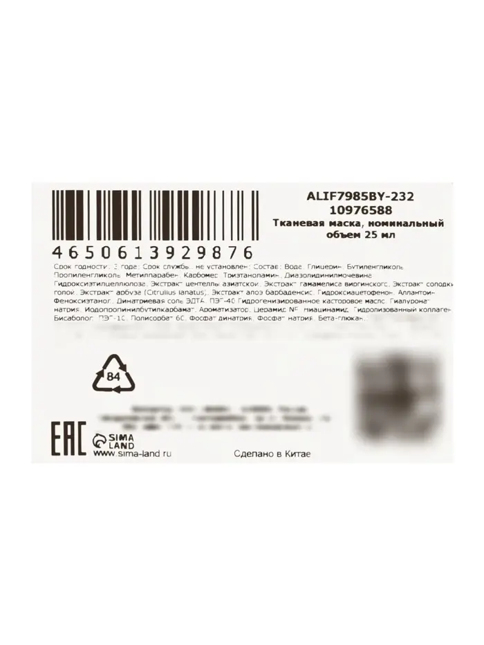 Вода, Глицерин, Бутиленгликоль, Пропиленгликоль, Метилпарабен, Карбомер, Триэтаноламин, Диазолидинилмочевина, Гидроксиэтилцеллюлоза, Экстракт центеллы азиатской, Экстракт гамамелиса виргинского, Экстракт солодки голой, Экстракт арбуза (Citrullus lanatus), Экстракт алоэ барбаденсис, Гидроксиацетофенон, Аллантоин, Феноксиэтанол, Динатриевая соль ЭДТА, ПЭГ-40 Гидрогенизированное касторовое масло, Гиалуронат натрия, Йодопропинилбутилкарбамат, Ароматизатор, Церамид NP, Ниацинамид, Гидролизованный коллаген, Бисаболол, ПЭГ-10, Полисорбат 60, Фосфат динатрия, Фосфат натрия, Бета-глюкан.