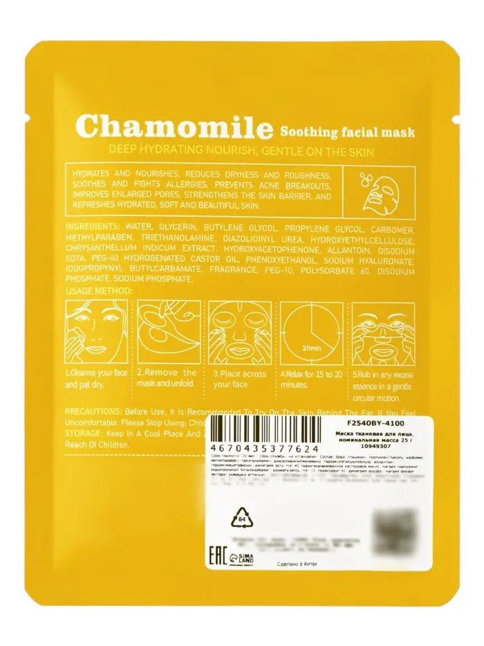 Тканевая увлажняющая маска для лица с экстрактом ромашки — это мягкое и эффективное средство для увлажнения, успокоения и восстановления кожи. Маска помогает сделать кожу мягкой, гладкой и сияющей, возвращая лицу свежий и ухоженный вид.