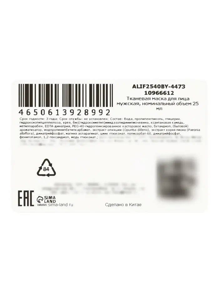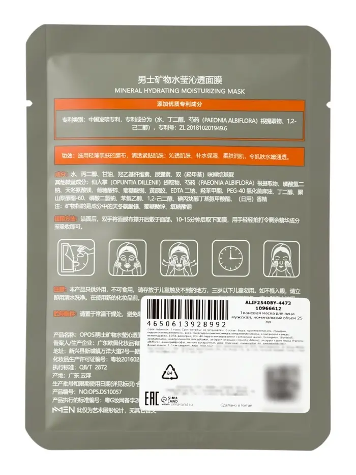 Мужская тканевая маска, увлажняющая, 25 мл